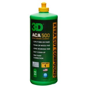 ACA X-tra Cut Compound Code: 500OZ08 3D ACA™ 500 X-TRA CUT COMPOUND™ is infused with ALPHA CERAMIC ALUMINA™. Alpha Ceramic Alumina™ is a revolutionary new abrasive which has been constructed to provide lower heat, high speed leveling which will correct even the most challenging clearcoats and single stage paint. This precisely engineered compound delivers TRUE PAINT PERFECTION in the absolute shortest amount of time. ACA™ 500 X-TRA CUT COMPOUND™ is extremely versatile. ACA™ 500 is aggressive enough to correct the hardest new ceramic clear coats and refined to the point that extremely soft clears are not over lacerated. It is easy to use, easy to clean-up, is sun friendly and contains “No” harmful Solvents, Kerosene or OSHA regulated CRYSTALLINE SILICA. ACA 500 X-TRA CUT COMPOUND™ can be perfectly paired with either a WOOL or FOAM pad and used with a rotary buffer or dual action polisher. 3D knows what every detailer wants; a simple TRUE PAINT CORRECTION SYSTEM that delivers the perfect finish in the shortest amount of time…EVERY TIME. 3D ACA™ 500 X-TRA CUT COMPOUND™ combined with 3D AAT™ 502 FINISHING POLISH™ is that system. A 3D Car Care Product