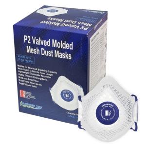 Moulded dust masks, P2, valved, box of 10. Mesh shell resists collapsing, increasing mask life.