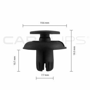 CC10623 - Car clip to fit Honda/Toyota Code: CC10623/25 Engine and Fender Liner Clips High quality aftermarket part Also commonly used on a range of Ford, Mitsubishi and Toyota vehicles Honda part number; 91501-S04-003, 91501S04003, 91512-SX0-003 Ford Part numbers; W711712-S300; 1429935 Mitsubishi part number; MU000319 Toyota part number; 9046708217, 90467-08217 Black colour, Nylon For 8mm hole HONDA; Very common Honda clip used on wheel arch linings and radiator grilles. The 8mm clip is a simple push rivet and replaces an 8mm screw rivet on many earlier models of Civic, CRX and Del Sol. Also used on some Honda Motorcycles FORD; These clips are widely used by Ford across their range of cars and vans. They are used on interior and exterior trim. Some vehicles use them for door cards but they are most commonly used for bumpers, sideskirts and wheel arch linings. They are also used for bonnet insulation clips on the latest model Transit (2014-). MITSUBISHI; Used on ASX and Galant for bumper mounts, Colt for fender liners and the Outlander for rocker covers TOYOTA; Used on Hilux, Landcruiser Prado 120 series and Corolla engine rocker covers, Avensis for Bumper mounts, Prius and Previa/Tarago for fender liners Location; Engine, Splashguard, wheel well and fender, grille, and bumper, Insulator, Rear Rocker Molding, Cowl Grille, Deflector. Commonly used on the following models; - Honda Accord - Honda Acty Truck - Honda Civic - Honda Crossroad - Honda Crosstour - Honda CRX - Honda CRV - Honda CRZ - Honda Edix - Honda Element - Honda Fit - Honda HR-V - Honda Insight - Honda Inspire - Honda Integra - Honda Jazz - Honda Legend - Honda Logo - Honda Mobilio - Honda Odyssey - Honda Pilot - Honda Prelude - Honda Ridgeline - Honda S2000 - Honda Shuttle - Honda Stepwgn - Honda Stream - Honda Street - Honda Vezel - Ford C-Max - Ford Escape - Ford Explorer - Ford Fiesta - Ford Focus - Ford Kuga - Ford Mondeo - Ford Torneo - Ford Transit - Mitsubishi ASX - Mitsubishi Colt - Mitsubishi Galant - Mitsubishi Outlander - Toyota Auris - Toyota Avensis - Toyota Aygo - Toyota Caldina - Toyota Corolla - Toyota Corona - Toyota Estima - Toyota Hilux - Toyota Ipsum - Toyota Land Cruiser Prado 120 series - Toyota Levin - Toyota Previa - Toyota Prius - Toyota Sprinter - Toyota Tacoma - Toyota Tarago - Acura CL - Acura Integra - Acura MDX - Acura RSX Honda Motorcycles; - GL1800 - Goldwing - FJS600 - NX500 - NX600 Compares with; - Wurth 150155463 - Auveco 19118 - Autoclips AC713 - RD41