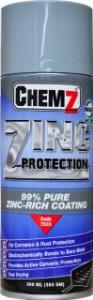Chemz Zinc Code: 7533 MPI Approved C23 ZINC RICH COATING FOR CORROSION & RUST PROTECTION Film contains 99% pure zinc, electrochemically bonds to bare metal, provides active galvanic protection, fast drying. Chemz Zinc is 99% epoxy based Zinc rich coating to inhibit rust and corrosion of metal surfaces. Chemz Zinc forms a tough and flexible film which electrochemically bonds to bare metal and acts as a sacrificial coating to prevent rust formation when scratched and abraded. Chemz Zinc is fast drying, shows excellent adhering qualities as a finishing or under coat and can be used on applications up to 500’C. Chemz Zinc protects metal (iron or steel) from corrosion during long term exposure to corrosive environments. Use on ELECTRICAL generation, transmission and distribution equipment including towers, transformers, light standards and other metal and galvanised surfaces. GENERAL use on structural steel or frames, machinery frames and bases, tank stands, gates, yards, farm machinery, boat trailers and sub frames, home and garden equipment, air conditioners and industrial motors. Excellent for touch-up on welding seams and spot welding repairs - For corrosion & rust protection - Electrochemically bonds to bare metal - Provides active galvanic protection - Fast drying