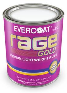 Rage® Gold, Gallon (3L) Code: 100112 Similar features to Z-Grip, easiest sanding and stain resistant. With all the attributes expected of an EVERCOAT lightweight Body Filler Formulated with the finest quality resin available similar to Polyester Glazing Putties. Evercoat’s easiest sanding body filler. The unsurpassed sanding qualities are attributed to Hattonite™, a unique ingredient which reduces heat and friction created by aggressive sanding. Rage Gold also contains ZNX-7® for adhesion to galvanized steel and aluminum. Plus, it’s stain resistant for use with basecoat/clearcoat paints. Part of the MetalWorks® System. Blue cream hardener included. Exceptionally easy sanding body filler. The ease of sanding is are attributed to Hattonite™, a unique ingredient which reduces heat and friction created by aggressive sanding. Rage Gold also contains ZNX-7® for adhesion to galvanized steel and aluminum. Plus, it’s stain resistant for use with basecoat/clearcoat paints. Part of the MetalWorks® System. Blue cream hardener included.