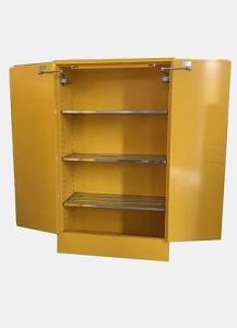 Galvanised steel shelves with vents to allow air flow and drain channels to ensure any liquid is forced to the shelf ends where is can enter the bund.