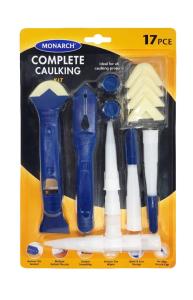 17 Piece Complete Caulking Kit Code: MM-3028 The Monarch 17 Piece Complete Caulking kit contains everything you need for your caulking project. Tools to remove, clean, apply, smooth and store your sealant, all in one handy set. The Monarch Complete Caulking Kit also includes reusable end caps to temporarily store sealants until the next renovation job or repair. Kit includes: 1 x pro caulking tool, 1 x caulk removing tool, 4 x replaceable wipers, 3 x standard nozzles, 2 x resealable nozzles, 4 x compact nozzles, 2 x end caps.