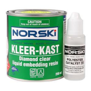 Norski Kleer Kast Resin 250gm Code: 66250 Kleer Kast is Norkis clear resin product typically for use with a mould and is normally used for smaller work. This polyester product is amazingly clear in it's natural state and capable of accepting the Norski pigments, dyes and mica powders. As with all polyesters, when cured, this resin will shrink fractionally, which assists in removal from a mould. KLEER KAST RESIN is specially designed for the making of transparent and coloured casts. The process is easy, but you should first study the instructions and if you are doing something a little different, then give Norski a call and let them share all their info with you in order to give you the best chance of a stunning result.