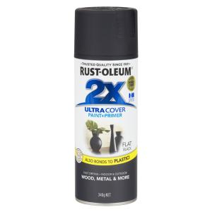 The breakthrough technology of 2X Ultra Cover means you’ll get twice the coverage in a single pass—which means your project will be done in half the time at half the cost of competitive brands. All of that, plus a smooth, glossy finish in black! For best results apply 2 or more light coats a few minutes apart. Spray in a steady back-and-forth motion. Rust-Oleum® 2X Ultra Cover Enamel Sprays are designed to provide twice the coverage on wood, metal, plastic, wicker and more. These sprays cover surfaces with less spray passes, allowing projects to be completed faster and easier. 2X Ultra Cover Enamel Sprays feature an any angle spray that allows you to spray in any direction, even upside down. A comfort spray tip with a wider finger pad reduces fatigue caused by continuous spraying. Not for use on galvanised metal. TIP: Some plastics made of polyethylene such as Little Tikes® children’s products are manufactured in a way that may hinder maximum paint adhesion. Test paint in an inconspicuous area first. - Ultimate Coverage - Smooth, durable finish - Any-angle spray with comfort spray tip FOR BEST RESULTS Apply 2 or more light coats a few minutes apart. Spray in a steady back-and-forth motion.