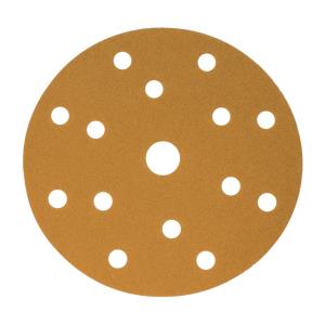 B338 Velcro Disc 150mm 15 Hole P180 Tan/Gold Oslong B338 velcro abrasive sanding disc. - Ø 150mm - Velcro backing - 180 Grit abrasive - 15 Hole - Box of 100 Code: OS7065180