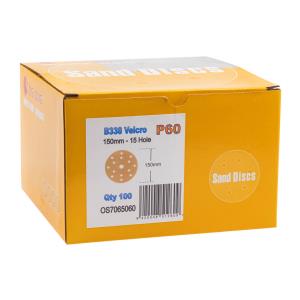 B338 Velcro Disc 150mm 15 Hole P60 Tan/Gold Code: OS7065060/50 Oslong B338 velcro abrasive sanding disc. - Ø 150mm - Velcro backing - 60 Grit abrasive - 15 Hole - Box of 50