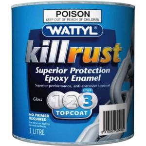 A rust inhibiting epoxy enamel finish. Wattyl Killrust Epoxy Enamel is a quality, anti-corrosive epoxy enamel specifically designed for iron and steel surfaces. The silicone and epoxy reinforced formulation provides a tough, flexible coating that has excellent durability properties. Wattyl Killrust Epoxy Enamel is perfect for protecting and decorating most metal surfaces around the home. It helps control rust, and the wide range of colours will help you achieve the look you are after. It can be used indoors or outdoors and with the correct primer/undercoat, you can even use it on timber, brick, cement, concrete and other surfaces.