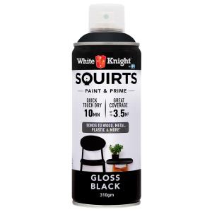 White Knight Squirts Gloss Black Code: 345621/310GM White Knight® Squirts is a high quality, quick drying acrylic enamel spray paint ideal for many projects around the home. The White Knight Squirts self-priming formula adheres to plastic, timber, metal, wicker, plastic, masonry and ceramic. It is ideal for use on canvas, furniture, toys, gates, doors, letterboxes, trim, fixtures and craft projects. Features - Paint and primer in one - Bonds to plastic, wood, metal and more - Quick drying - Touch dry in 10 minutes - Excellent coverage - 3.5 m² - Hard wearing - Clean & bright whites - Interior and exterior use - Safe to spray - CFC and lead free